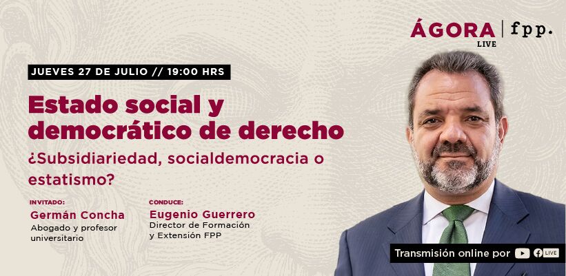 Este próximo jueves 27 de julio a las 19:00 horas, Germán Concha, abogado y profesor universitario y Eugenio Guerrero, director de Formación y Extensión FPP, conversarán sobre el significado de lo que se ha llamado el «Estado social y democrático de derecho» y de cuáles implicancias podría traer para Chile, su institucionalidad, la democracia y la economía. ¿Es el «Estado social» compatible con un «Estado subsidiario»? ¿Representa el «Estado social» una amenaza para la institucionalidad liberal y democrática del Chile actual? ¿Existen riesgos de que el Consejo Constitucional presente como propuesta un modelo estatista para Chile bajo la fórmula del «Estado social y democrático de derecho»?