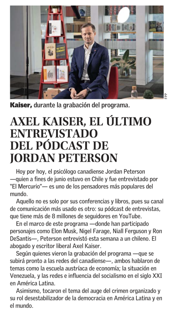 En el marco de este programa —donde han participado personajes como Elon Musk, Nigel Farage, Niall Ferguson y Ron DeSantis—, Peterson entrevistó esta semana a un chileno. El abogado y escritor liberal Axel Kaiser.