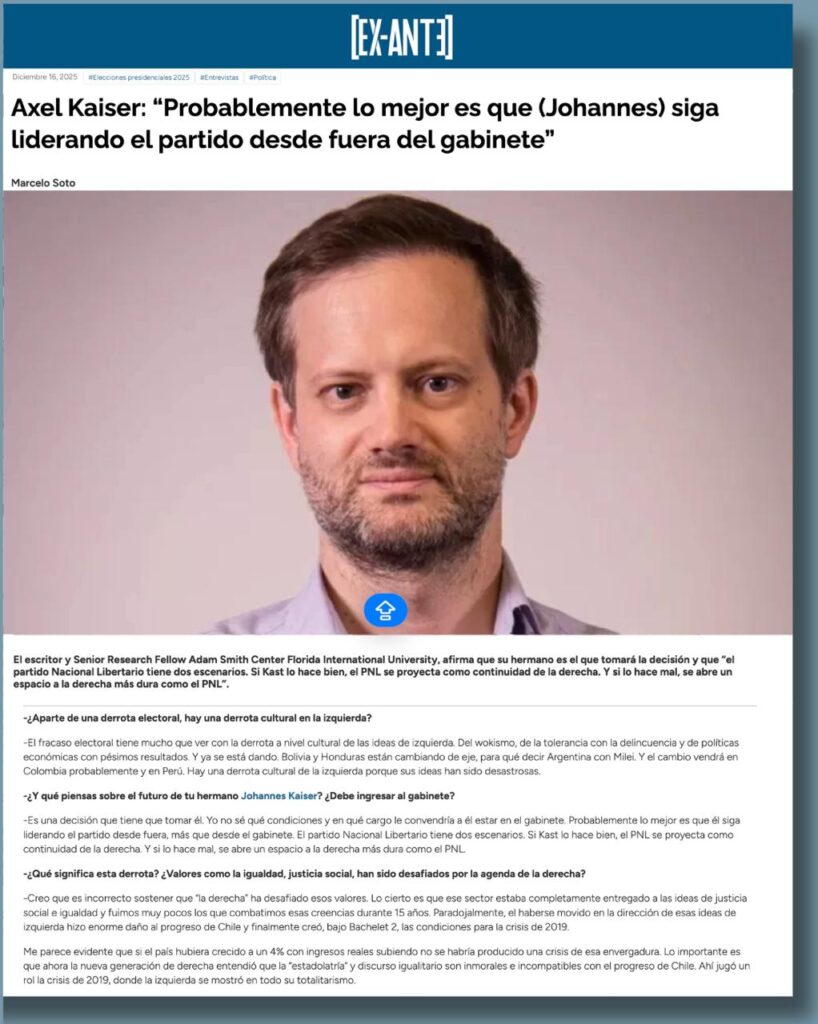El escritor y Senior Research Fellow Adam Smith Center Florida International University, afirma que su hermano es el que tomará la decisión y que «el partido Nacional Libertario tiene dos escenarios. Si Kast lo hace bien, el PNL se proyecta como continuidad de la derecha. Y si lo hace mal, se abre un espacio a la derecha más dura como el PNL».