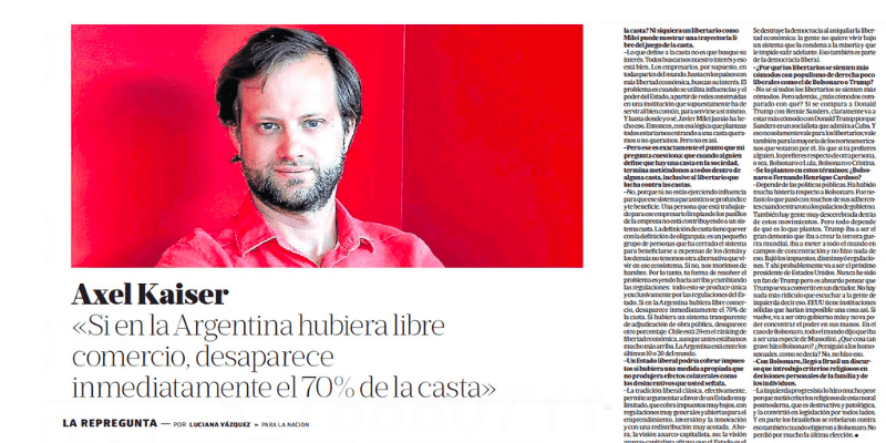 -Sí, es un argumento político. Los argumentos políticos son difíciles de matizar. Cuando estás en una campaña en un país que está sufriendo estragos económicos, como sufre la Argentina, no puedes hacer el análisis más sofisticado, académico. Hace poco, estuve un par de meses viviendo en la Argentina. Pero lo que está claro es que la Argentina es lo que en economía política se llama un “orden de acceso limitado”, es decir, es una sociedad buscadora de renta, una sociedad parasítica donde todos los grupos de interés intentan vivir a expensa de todos los demás. Se genera una dinámica de extractivismo a partir de las conexiones que determinados grupos tienen con el Estado. Y no sólo me refiero a empresarios que esperan que toda la producción sea nacional y que esté cerrado el libre comercio, o a políticos que viven del Estado y que ponen a sus amigos y que, además, hacen todo tipo de cosas corruptas con la obra pública. También hay sectores de la sociedad que se acostumbran a recibir transferencias del Estado y que terminan siendo voto cautivo. Entonces, ¿cuál es la casta? Aquellos que tienen poder de decisión y que, en lugar de gobernar en pos el bien común, gobiernan por su propio interés y el interés de aquellos que los apoyan. Esto es algo muy antiguo en la filosofía. Aristóteles distinguía entre distintos gobiernos. Cuando la monarquía dejaba de preocuparse del bien común para convertirse en un instrumento al servicio de quien tiene el poder, se convierte en una tiranía. Lo mismo pasa con la aristocracia: cuando ya no se preocupa por el bien común, pasa a llamarse oligarquía. Y lo que tú tienes hoy día en la Argentina, es una oligarquía espantosa que tiene al país destrozado. Ese contexto hace que si tú no juegas dentro de esas reglas, aunque no quieras, no puedes sobrevivir. Y ese es el gran problema que tiene la Argentina. Y el único que lo denuncia como tiene que ser es Javier Milei.