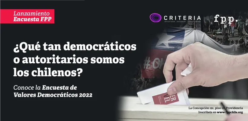La percepción democrática de los chilenos, sus valoraciones sobre la violencia como herramienta política, las posiciones acerca de la censura de ideas y la legitimidad de las instituciones; son algunas de las dimensiones que abarca la segunda edición de la Encuesta de Valores Democráticos, realizada por la Fundación para el Progreso junto a Criteria Chile, publicada oficialmente el 12 de mayo.