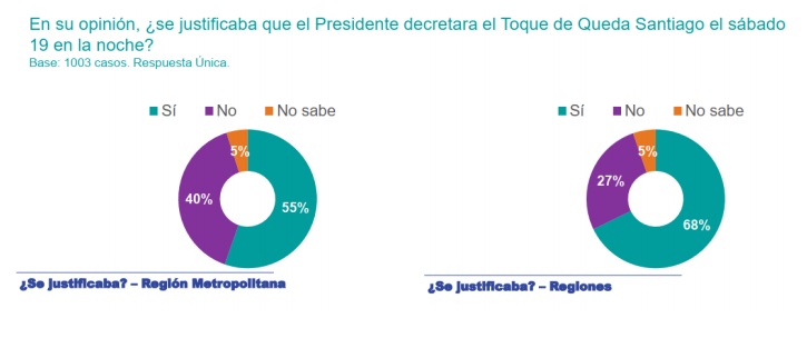 Diferencia Santiago/Regiones. Llama la atención la diferencia entre Santiago y Regiones en la justificación del toque de queda. Mientras en Santiago la justificación solo alcanzó un 55%, en regiones el porcentaje ascendió a un 68%[68]