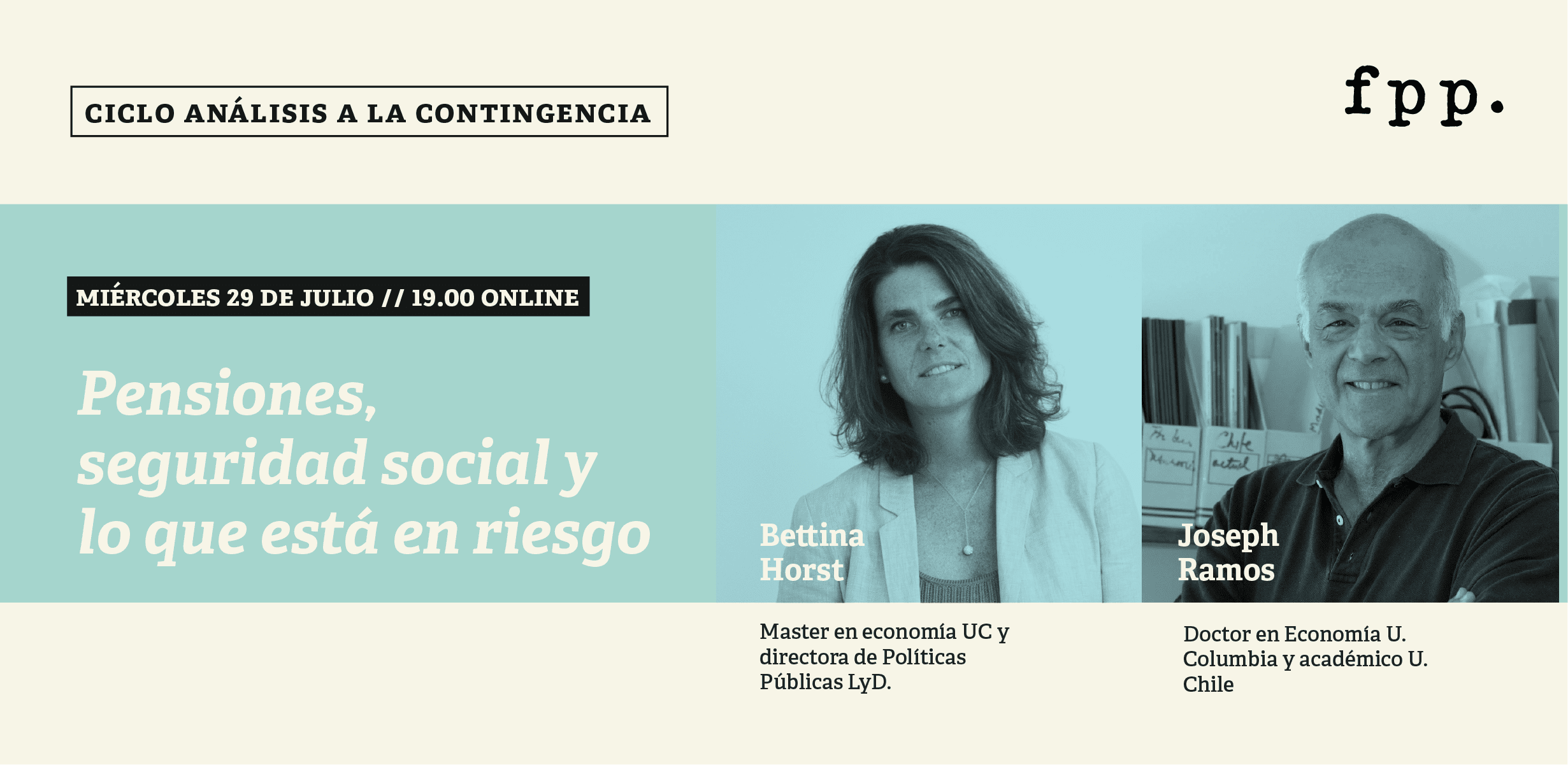 FPP te invita a la segunda sesión del ciclo de análisis a la contingencia con Bettina Horst y Joseph Ramos, para discutir y reflexionar sobre la ventajas y desventajas del retiro de los fondos de pensiones desde una perspectiva liberal, discutir sobre qué entendemos por seguridad social, lo que está en riesgo cuando se considera el ahorro de pensiones como rescate frente a las crisis económicas y cuales son las medidas que deberá tomar el país para garantizar pensiones a sus ciudadanos.