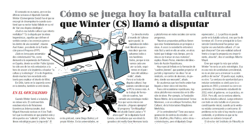 ¿Y la centroderecha? Tiene una nueva generación de centros de estudios —el IES, IdeaPaís y Res Publica, entre otros— e intelectuales, pero el diputado Diego Schalper (RN) reconoce que falta. «En general, la centroderecha es más asidua al catálogo de políticas públicas que al proyecto político», diagnostica. Cree que están al debe en generar una «narrativa política» y llegar con ella «a los lugares donde se da la batalla cultural: liceos, universidades, organizaciones vecinales. Eso requiere de personas que dediquen su energía a transmitir estas ideas. En eso, mi sector me parece que hace extremadamente poco, no hace todo el esfuerzo que debiera».