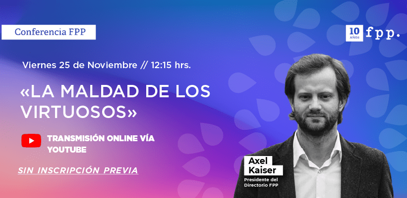 «La maldad de los virtuosos», conferencia de Axel Kaiser, presidente del directorio FPP, será transmitida en vivo por nuestro canal de Youtube, este viernes a las 12:15 PM.