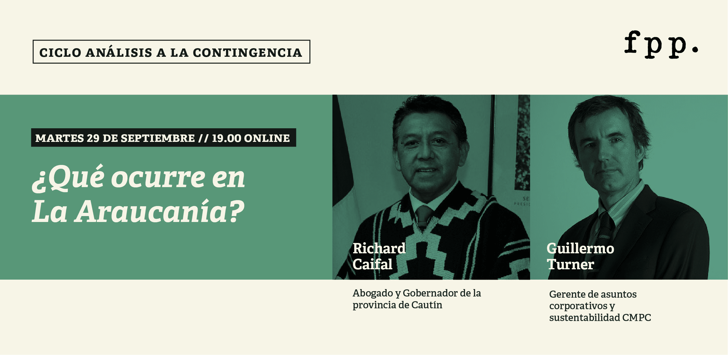 Es por esto que desde FPP queremos discutir este tema, para entender qué ocurre en La Araucanía y cómo, por medio de la reflexión, podríamos dar posibles soluciones a un problema que daña a muchas familias del sur del país, desde una perspectiva económica, social y política junto a Richard Caifal, abogado, mapuche y actual gobernador de la provincia de Cautín, y Guillermo Turner, Gerente de Asuntos Corporativos y Sustentabilidad de empresas CMPC.
