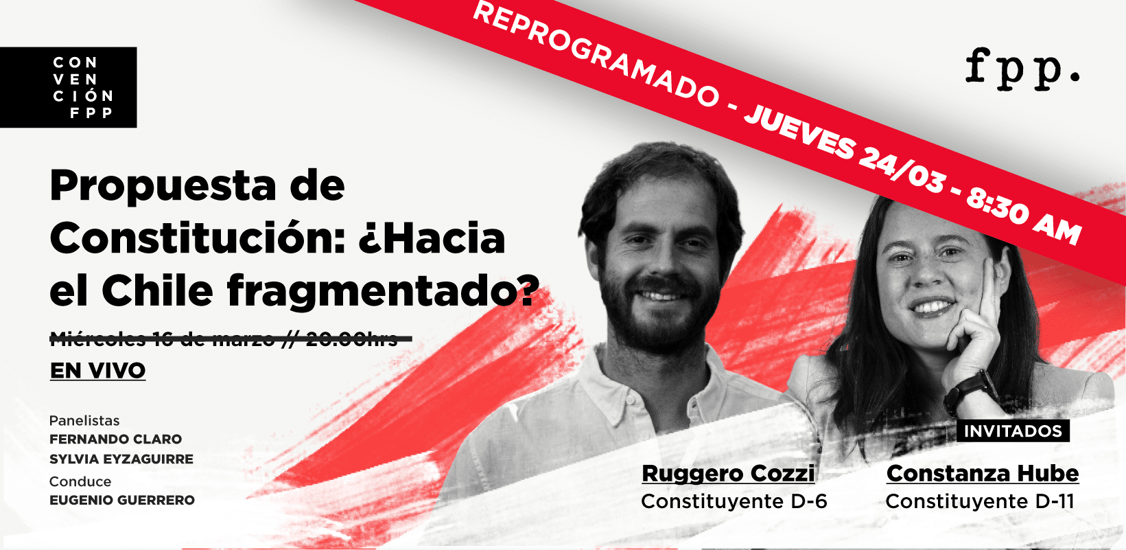 En esta oportunidad contaremos con nuestros panelistas Fernando Claro, director ejecutivo de FPP, Sylvia Eyzaguirre, investigadora del CEP junto a los constituyentes Constanza Hube (distrito 11) y Ruggero Cozzi (distrito 6), en una conversación conducida, como siempre, por Eugenio Guerrero, director de Divulgación de FPP.
