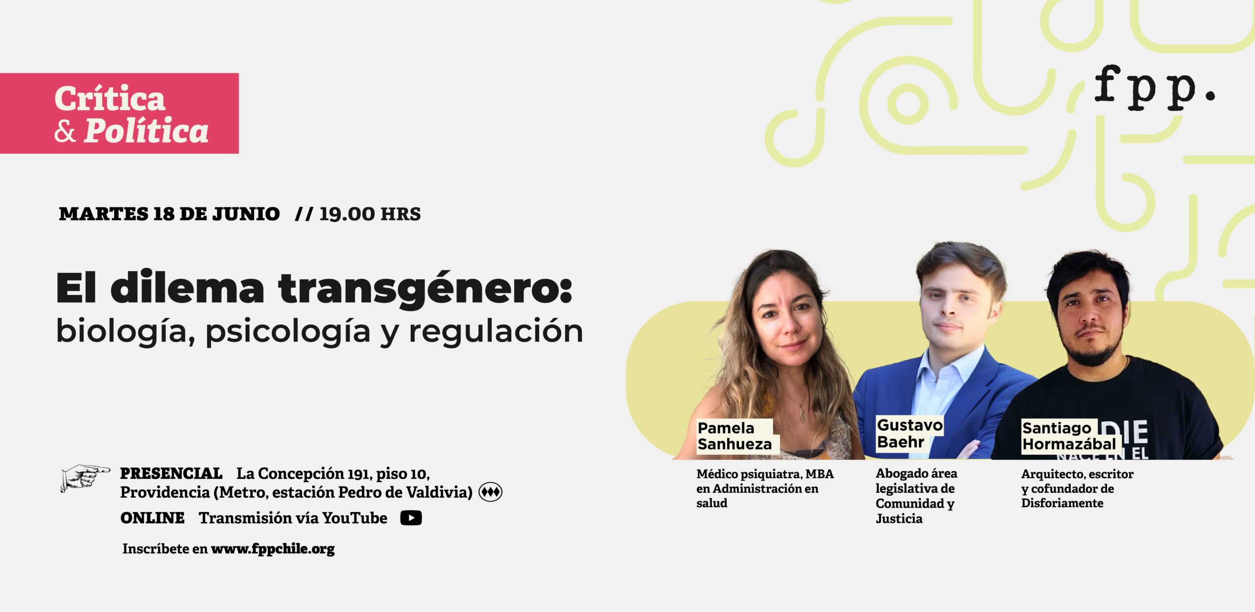 En esta oportunidad nos acompañarán Santiago Hormazábal, arquitecto, escritor y cofundador de Disforiamente; Gustavo Baerh, abogado, y asesor del área legislativa de la Corporación Comunidad y Justicia, y Pamela Sanhueza, médico psiquiatra, MBA en Administración en Salud.