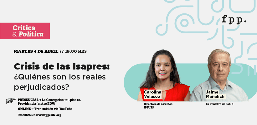Fundación para el Progreso te invita a una nueva sesión del ciclo Crítica y Política para reflexionar y deliberar acerca de la actual situación de las Isapres como institución, la presente crisis del sistema público de salud, las implicancias de los fallos de la Corte Suprema respecto de la sustentabilidad del sistema privado y las consecuencias de largo alcance que podrían generarse en el sistema estatal de salud al verse perjudicadas las Instituciones de Salud Previsional.