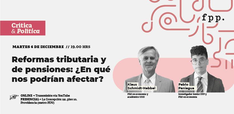 Para profundizar sobre el alcance de las reformas tributaria y de pensiones, la Fundación para el Progreso tiene el agrado de invitarte a una conferencia exclusiva con Klaus Schmidt-Hebbel, PhD en economía y académico de la Universidad del Desarrollo, y Pablo Paniagua, PhD en economía e investigador FPP, martes 6 de diciembre a las 19:00 horas