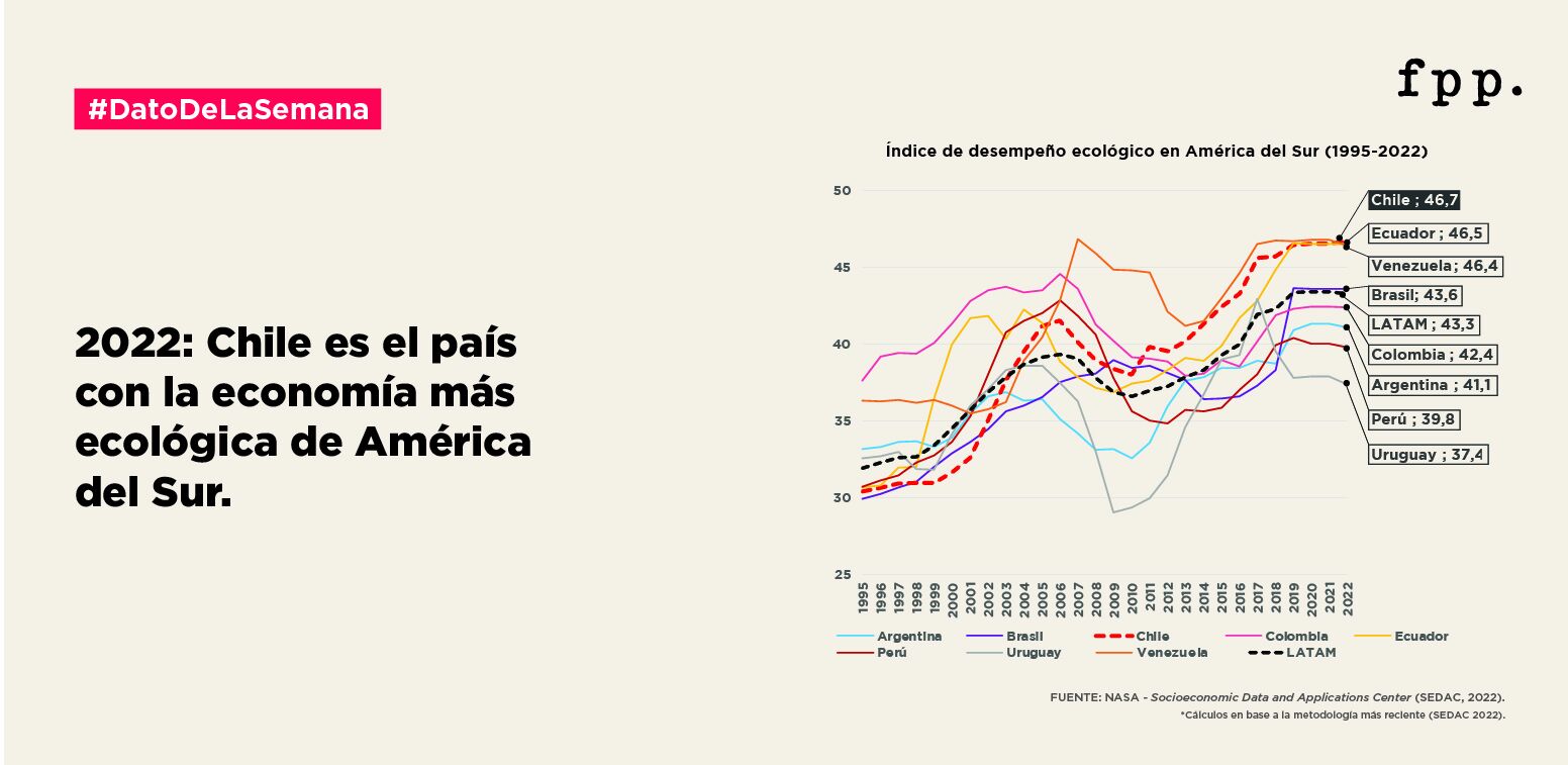Hace tan solo 20 años, Chile tenía uno de los peores desempeños ecológicos en América del Sur. Sin embargo, en 2022, la sustentabilidad ecológica de nuestra economía llegó a ser la mejor evaluada en la región. Durante la última década, la mejora en nuestro desempeño ecológico se explica, principalmente, por un aumento de nuestra Biodiversidad (+24,5%) y por una mejora de los Servicios de Ecosistemas (+10,7%) A pesar de lo anterior, Chile se ubica en el puesto nº65 en el ranking mundial de desempeño ecológico, por lo que aún nos queda mucho trabajo por hacer para alcanzar el nivel de países desarrollados.