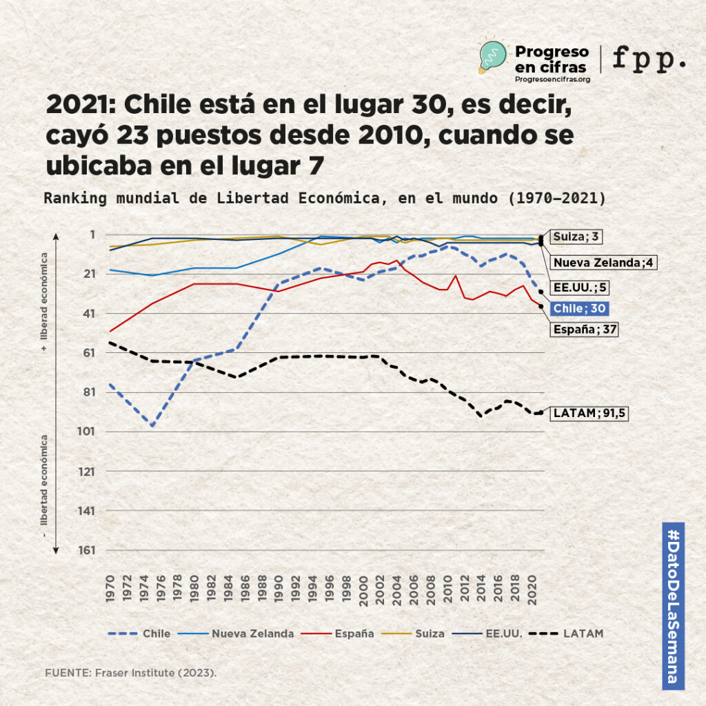 Según el informe Libertad Económica del Mundo (2023) publicado por el Fraser Institute de Canadá, la libertad económica de Chile en 2021 disminuyó comparando con 2020, principalmente, debido al exceso de regulación estatal e inflación causada por el exceso de liquidez que trajeron las ayudas fiscales y los retiros de los fondos de pensiones. Lo anterior nos hizo caer 6 puestos en el ranking mundial de libertad económica (del nº24 en 2020 al nº30 en 2021).
