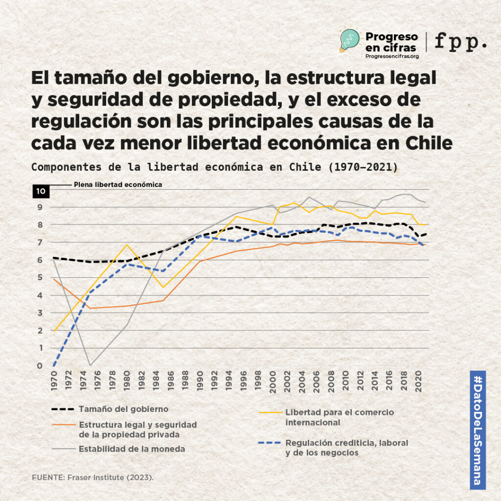 A pesar de lo anterior, durante la última década (2012-2021), Chile ha visto su libertad económica amenazada, perdiendo puntaje, principalmente, por el aumento del tamaño del gobierno (-7%), la poca seguridad de la propiedad (-2,6%)  y la regulación estatal de nuestros mercados (-12%).