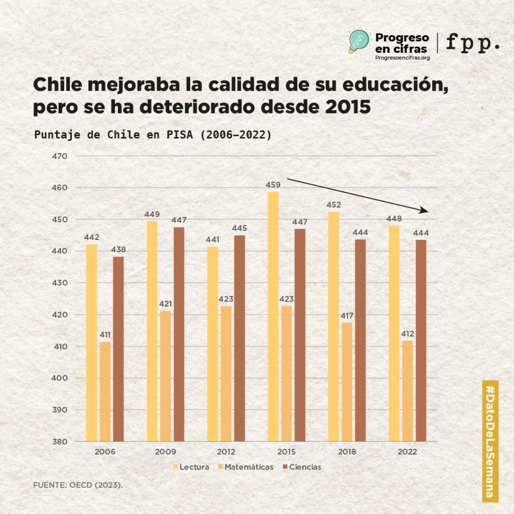 Sin embargo, las constantes interrupciones de las clases por paros de estudiantes y profesores, la falta de autonomía de las escuelas, y los efectos negativos de la pandemia —que, sorprendentemente, afectaron más al desempeño promedio de la OECD y la UE que al de Chile— podrían ser algunas explicaciones del retroceso que experimentan los estudiantes chilenos en su desempeño: entre 2015 y 2022, la calidad de la educación en Chile se redujo 2,3% en lectura, 2,6% en matemáticas y 0,8% en ciencias.