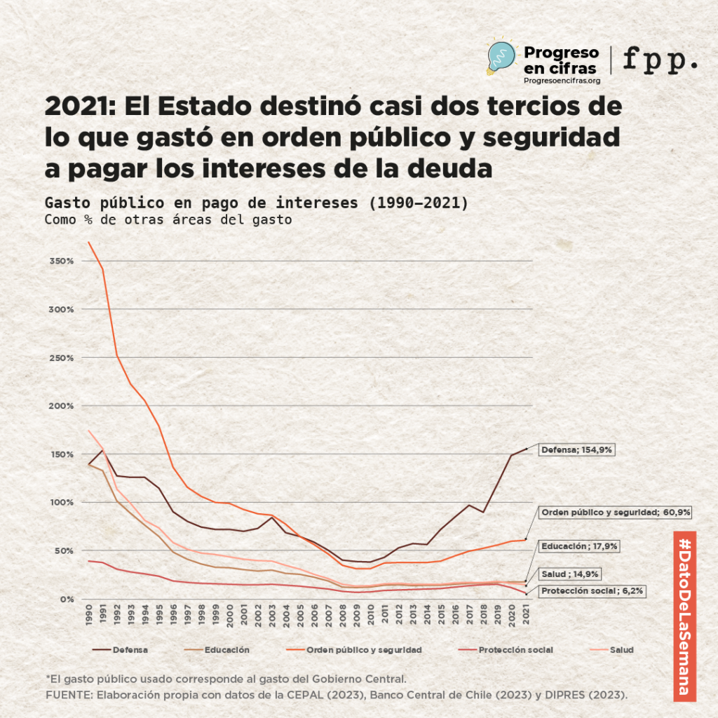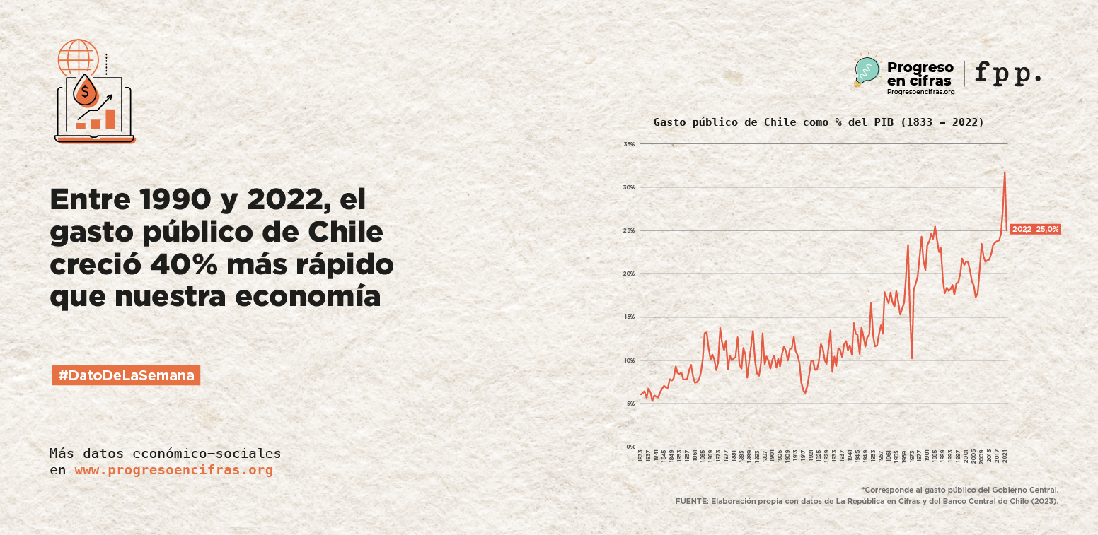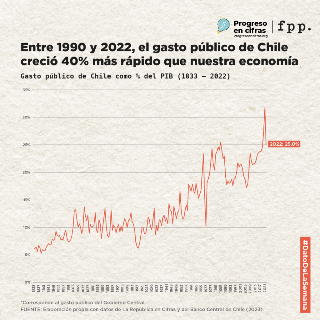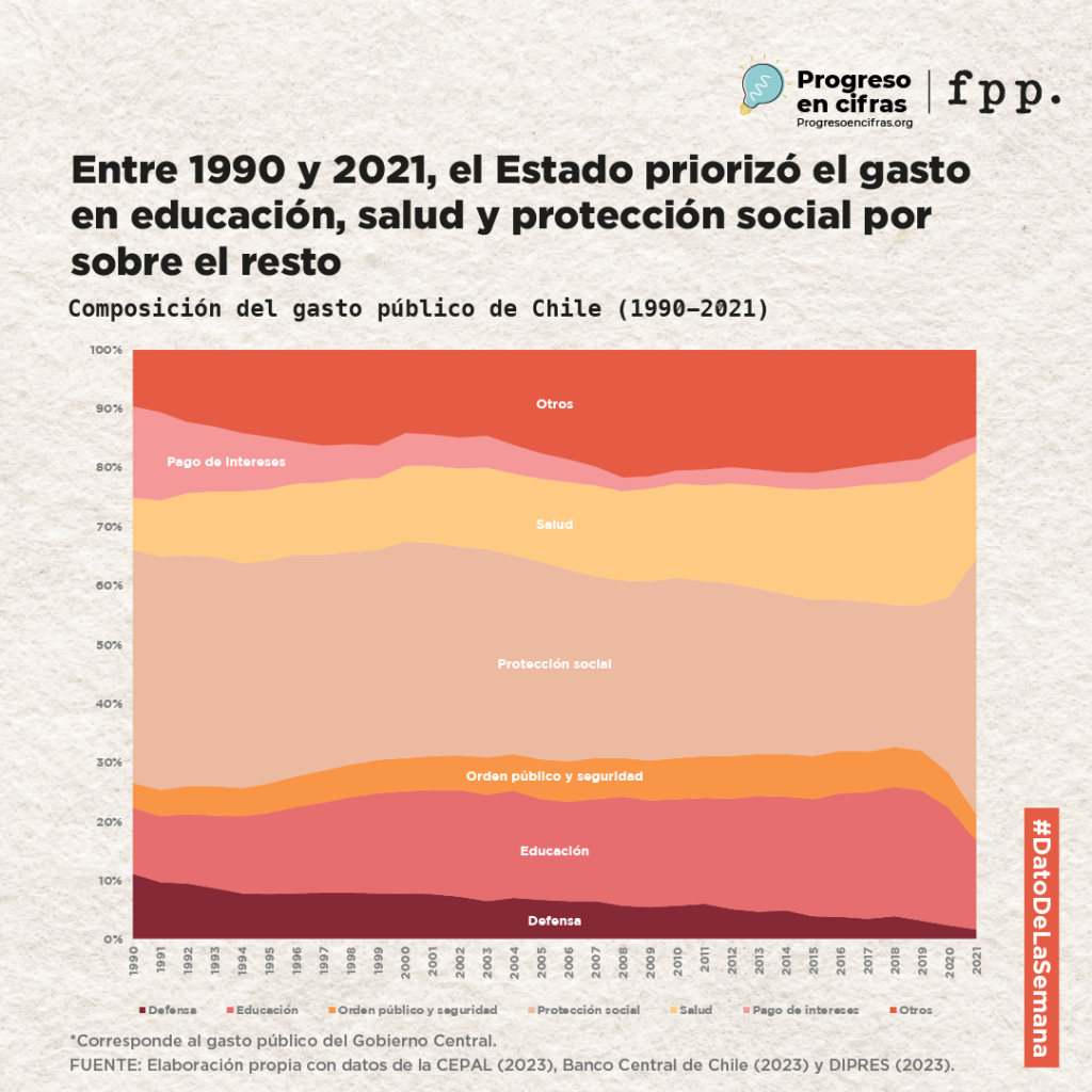 Entre 1990 y 2022, el gasto público de Chile aumentó alrededor de 40% en relación a su economía. En ese período, además, el Estado ha cambiado sus prioridades de gasto. Si bien a comienzos de la década de los 90, el Estado gastaba más en pagar los intereses de la deuda pública que en educación, salud u orden público, en la actualidad, el gasto público ha priorizado más esos aspectos sociales.
