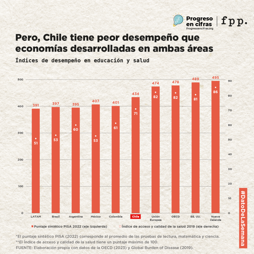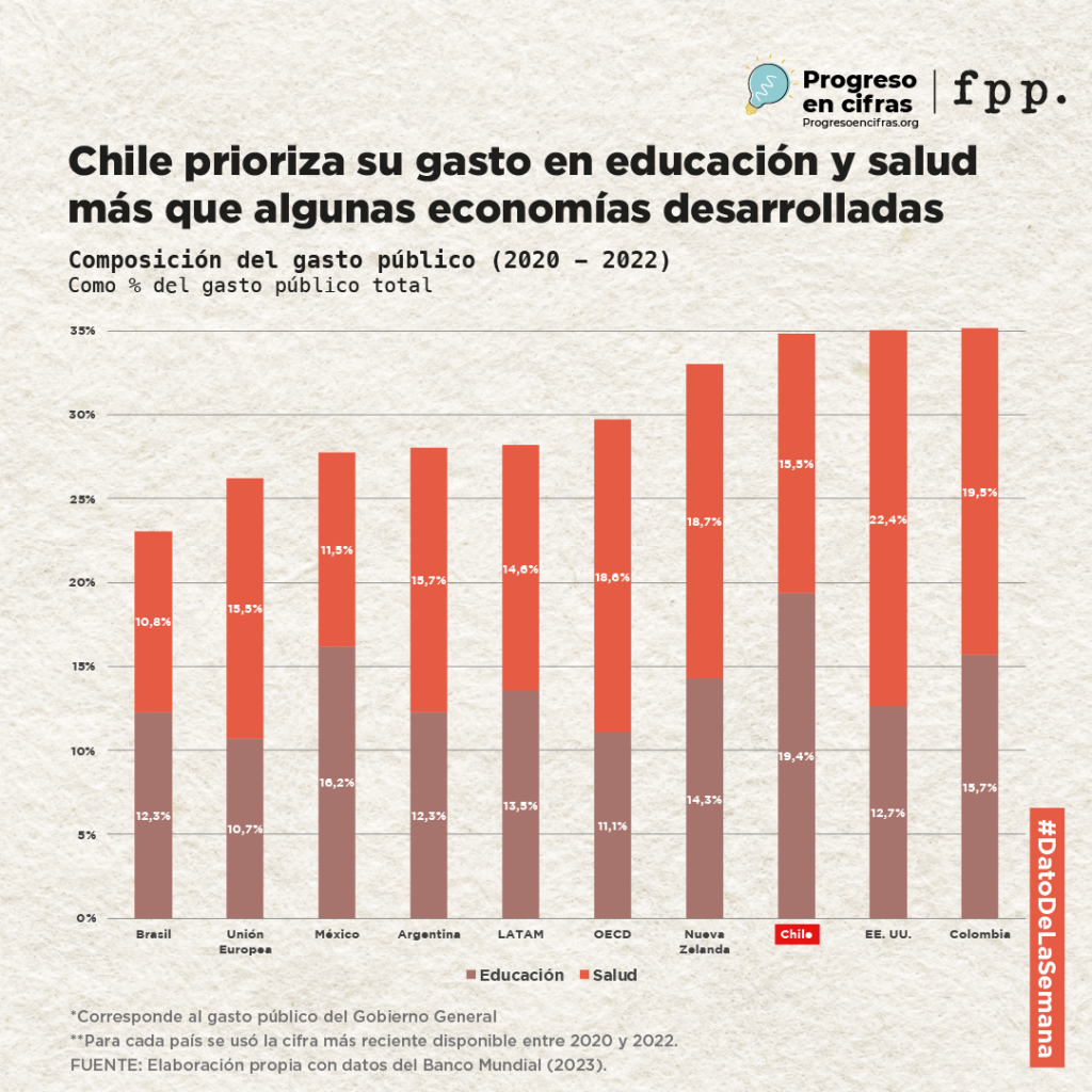 Más aún, Chile destina gran parte de su gasto público al financiamiento de la educación y la salud: mucho más que otros países de América Latina e incluso más que algunos países desarrollados. Sin embargo, la eficiencia de ese gasto denota falencias, ya que, aun gastando más, tenemos resultados pobres en educación y salud en comparación al mundo desarrollado.