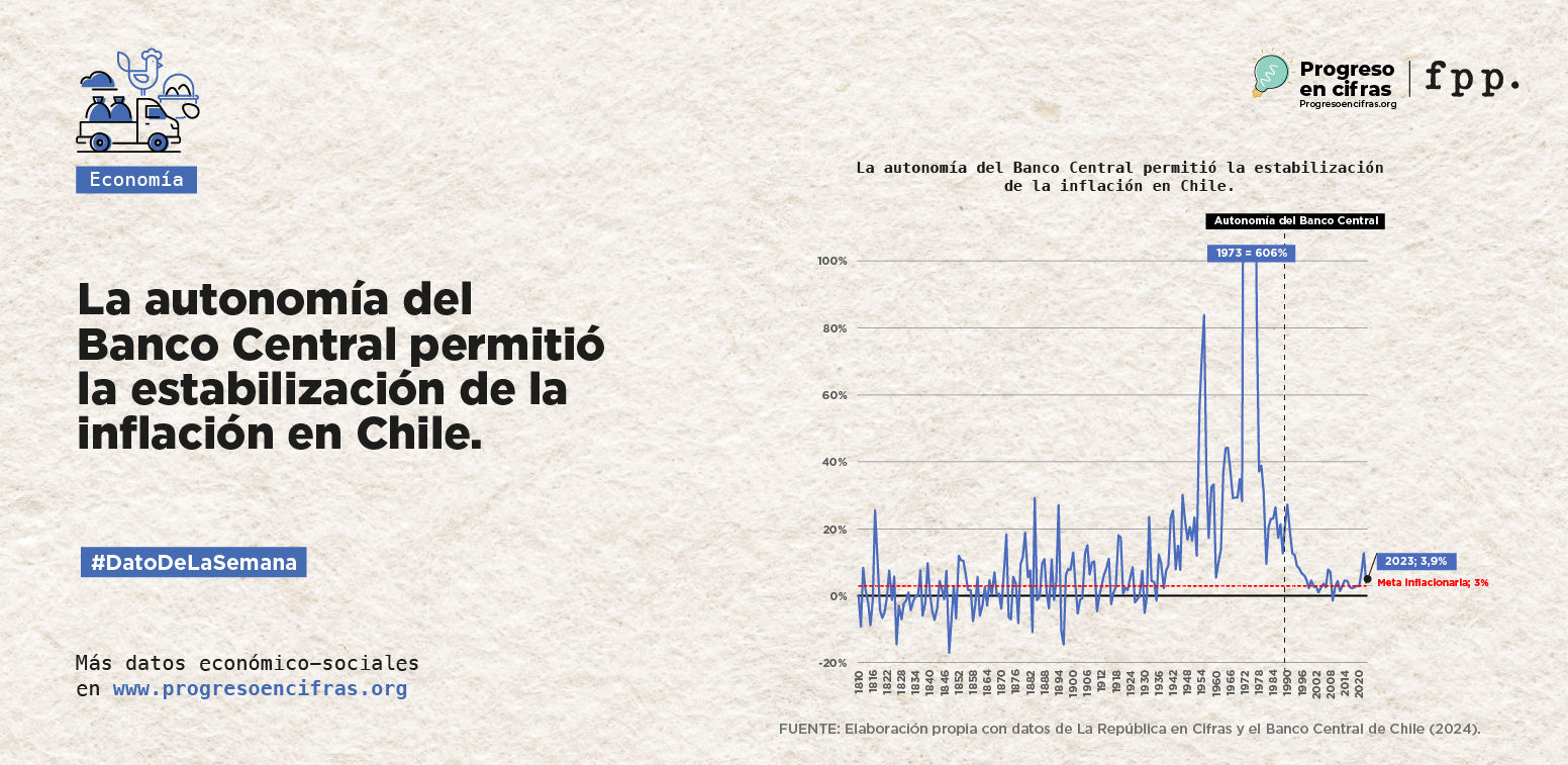 Desde su independencia, Chile ha tenido múltiples períodos inflacionarios y deflacionarios, inclusive la hiper inflación de 1973 que llegó a un 606% anual. No fue hasta que el Banco Central consiguió su autonomía en 1989 que Chile pudo frenar las alzas sostenidas de precios. Así, durante los últimos 23 años, Chile ha logrado mantener un promedio de inflación anual de 3%.
