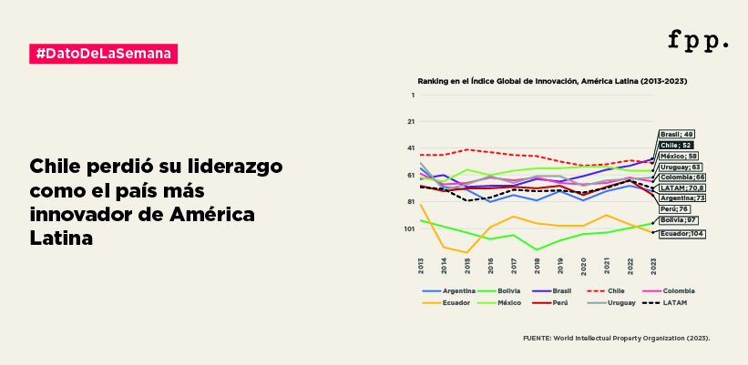 En 2023, Chile perdió el liderazgo como el país más innovador de América Latina por primera vez desde que existe esa medición, siendo superado por Brasil. Entre 2022 y 2023 caímos desde la posición nº50 a la nº52 en el ranking mundial de innovación, principalmente, por el deterioro de nuestras instituciones relacionadas a la creación de empresas. Es decir, emprender se ha hecho más difícil en nuestra economía. Lo anterior se ve reflejado en la creación de propiedad intelectual, como patentes y marcas, cuyas solicitudes cayeron 24% en la última década. Además, la creación de nuevas empresas que, después de incrementar a máximos históricos en 2021, ahora se ha estancado por niveles que en promedio son más bajos a lo que veíamos antes de la pandemia y crisis social.