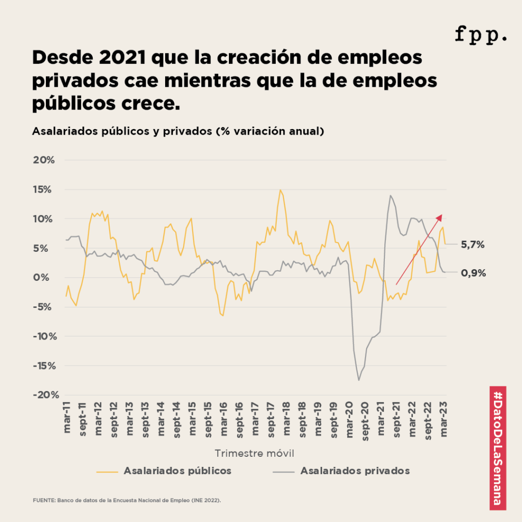 Desde 2021, la desaceleración de la economía ha provocado que la creación de empleos privados caiga, mientras que, por el contrario, a pesar de la crisis, la creación de empleo público ha subido un 5,7% en el último año.