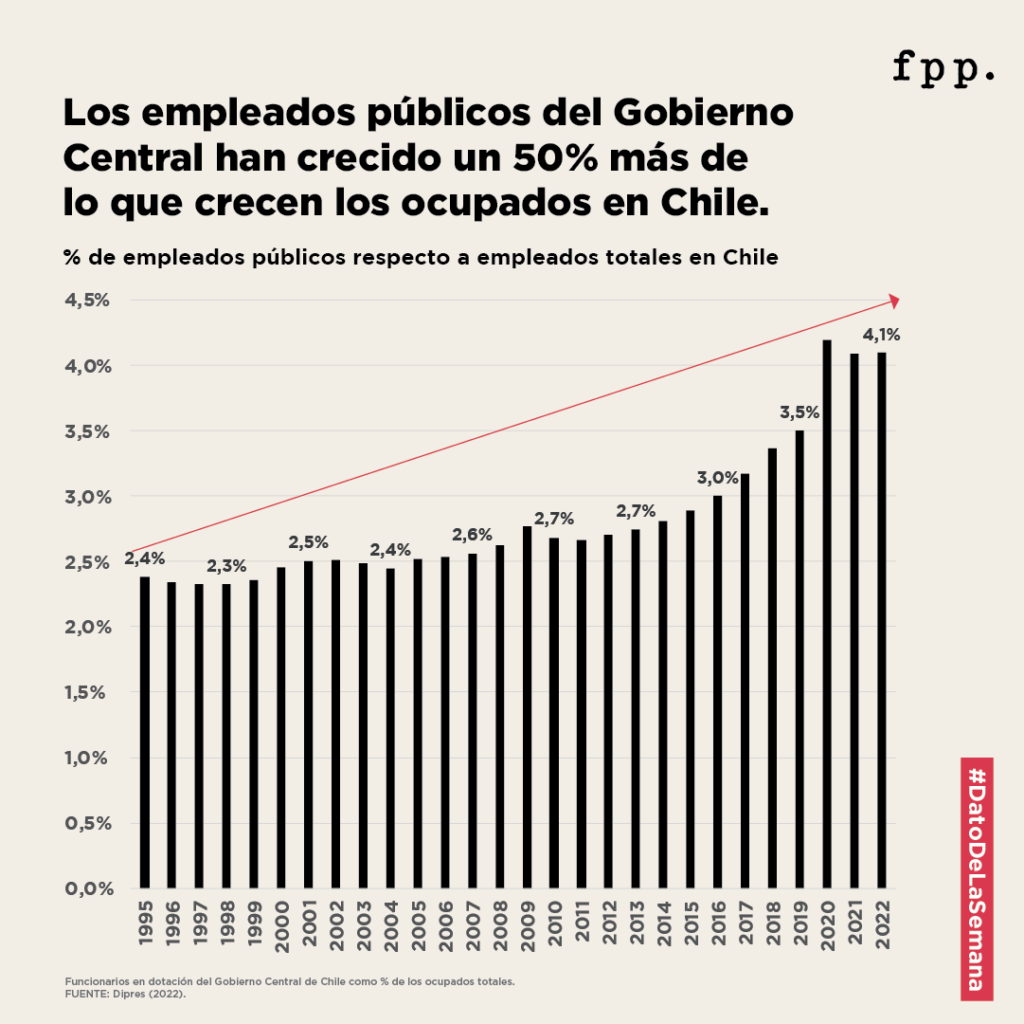 Los funcionarios del Gobierno Central (como % de los ocupados) han aumentado 50% en los últimos 10 años y un 70% desde 1995. El crecimiento del Estado sin mejora en su calidad de servicios es preocupante ya que solo significa más burocracia financiada con plata de todos nosotros los chilenos. Un mayor tamaño del gobierno está asociado, por lo general, a menor eficiencia del gasto público y menor crecimiento económico.