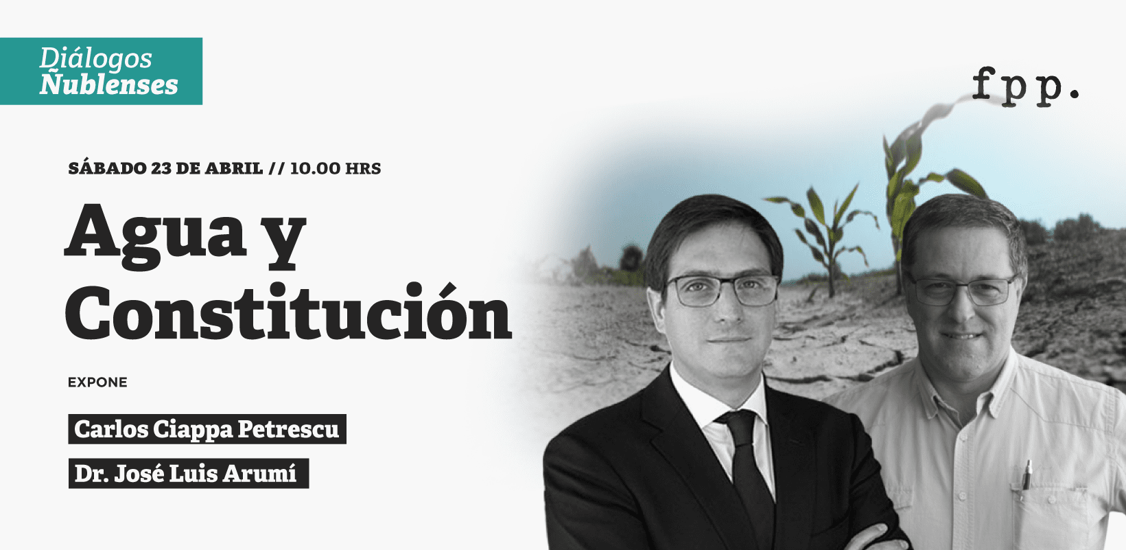 Fundación para el Progreso te invita a una la primera versión de Diálogos Ñublenses. Esta primera fecha tocaremos los temas “Agua y Constitución”, junto a los panelistas José Luis Arumí, académico de la Universidad de Concepción y Carlos Ciappa Petrescu, abogado de regulación minera y aguas. Te esperamos.