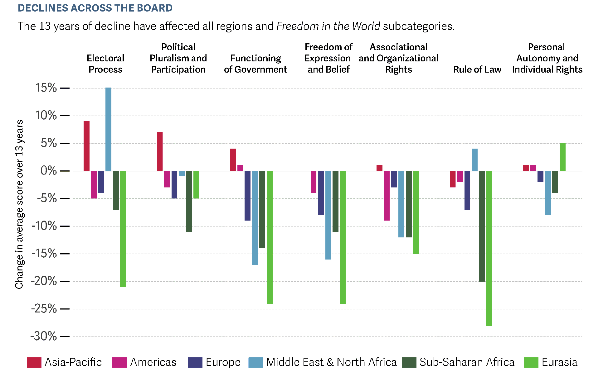 Más allá de dicho caso particular, el auge del iliberalismo puede provocar la desintegración o erosión de instituciones fundamentales. Freedom House destaca los periodos y procesos electorales, la libertad de expresión, la seguridad y estabilidad o los derechos de los migrantes y minorías étnicas.
