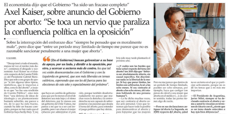 Publicado en El Mercurio, 07.06.2024 «Decepcionó a todo el mundo, menos tal vez al núcleo más duro», comienza el abogado y economista Axel Kaiser su evaluación respecto de la Cuenta Pública del Presidente Gabriel Boric. Dice que solo a ese grupo de apoyo «le tiró algunas ideas típicas, simbólicas, que le importan a ellos, como lo del aborto», e insiste en que «no fue una rendición de Cuenta Pública», sino más bien «una defensa de ideas de ideología y un planteamiento bastante soberbio, me parece a mí, de lo que ha sido bueno, cuando ha sido un fracaso completo, porque no hay nada que el Gobierno haya hecho bien. Y eso no es algo que se diga desde el punto de vista partisano, es que objetivamente no han hecho nada bien. Es más, yo diría que todo lo han hecho mal», y menciona como ejemplos las áreas de Educación, Salud, Seguridad, Migración y Economía.