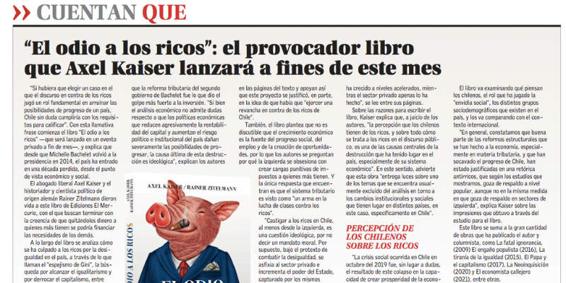 «Castigar a los ricos en Chile, al menos desde la izquierda, es una cuestión ideológica, por no decir un mandato moral. Por supuesto, bajo el pretexto de combatir la desigualdad, se asfixia al sector privado e incrementa el poder del Estado, capturado por los mismos políticos que no dejan de caer en escándalos de corrupción por el mal uso que hacen de los dineros que pagan los contribuyentes. En parte, producto de esta ideología igualitarista y antirricos, el gasto del Estado ha crecido a niveles acelerados, mientras el sector privado apenas lo ha hecho», se lee entre sus páginas.