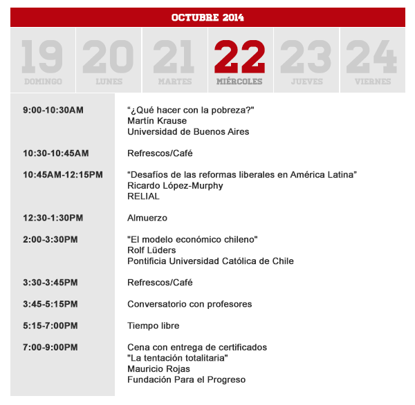 Por tercer año consecutivo, Cato Institute y la Fundación para el Progreso realizarán el encuentro para jóvenes latinoamericanos del 19 al 23 de octubre de 2014 en Reñaca, Chile. ¿En qué consiste el liberalismo clásico? ¿En qué se basó el éxito del modelo económico chileno? ¿Cuáles son las soluciones liberales a la pobreza? Estas serán algunas de las temáticas que abordaremos.
