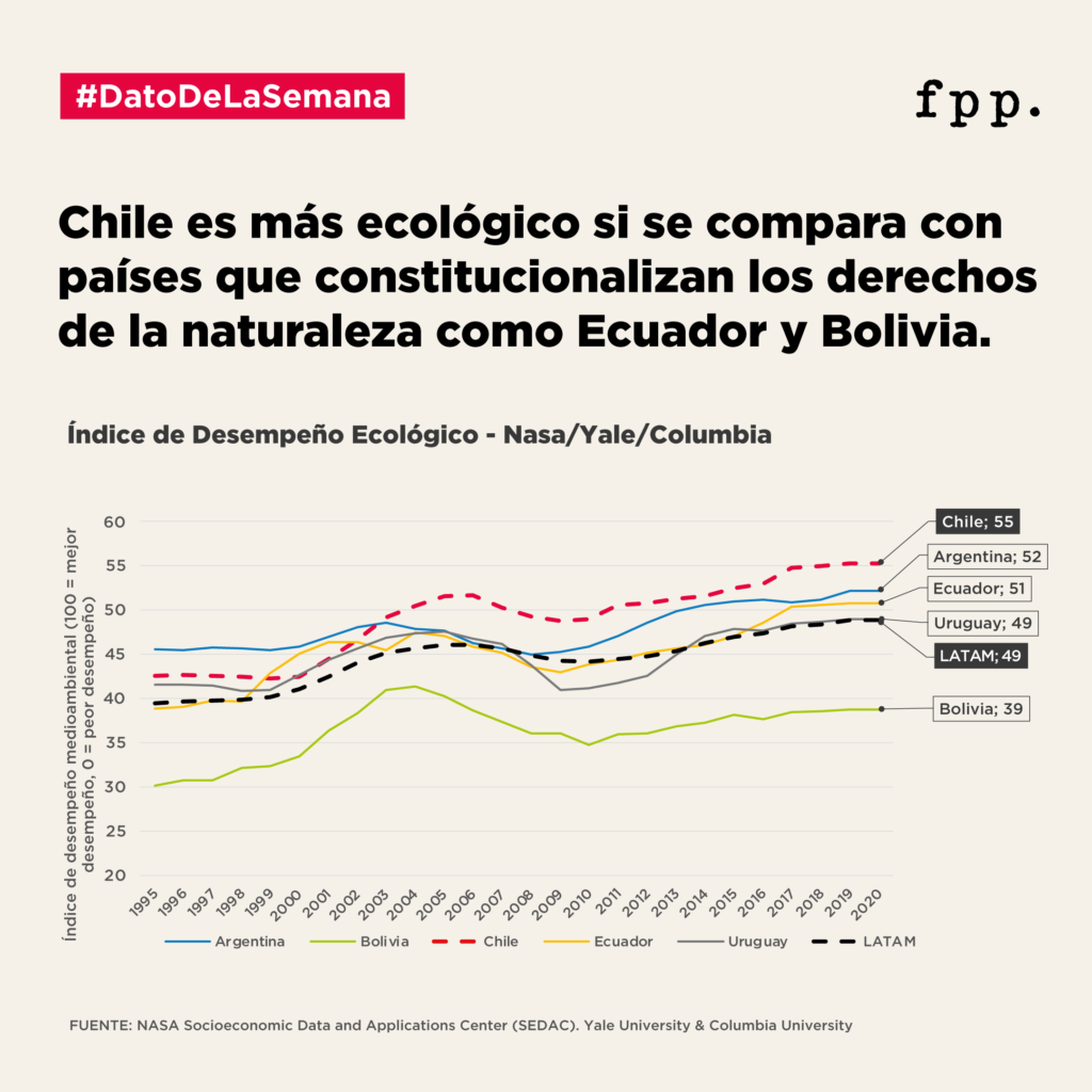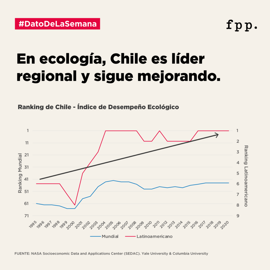 Según el Índice de Desempeño Ecológico 2020, publicado periódicamente por la NASA y las universidades de Yale y Columbia, Chile es el país más ecológico de América Latina, y el número 44 en el mundo. De las 11 categorías diferentes que componen este índice, Chile obtiene un puntaje por sobre el promedio regional y mundial en 9 de ellas. Si bien durante los últimos 10 años Chile ha empeorado en los índices que miden la contaminación del aire, ha mejorado sustancialmente en los que miden Cambio Climático y Biodiversidad & Habitat.