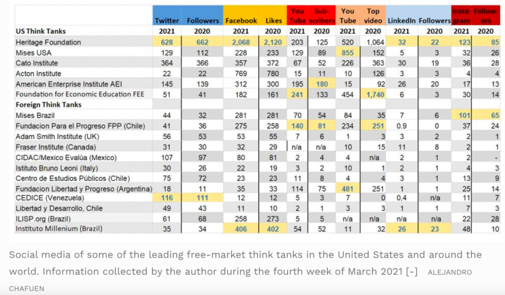 El "Ranking de think tanks liberales, medidos por su impacto en redes sociales", es entregado por Alejandro Chafuen, director ejecutivo internacional de Acton Institute, todos los años a través de Forbes, y presenta el listado de organizaciones defensoras del libre mercado con más influencia en plataformas digitales como YouTube, Facebook, Instagram, Twitter, LinkedIn, Spotify, entre otras.
