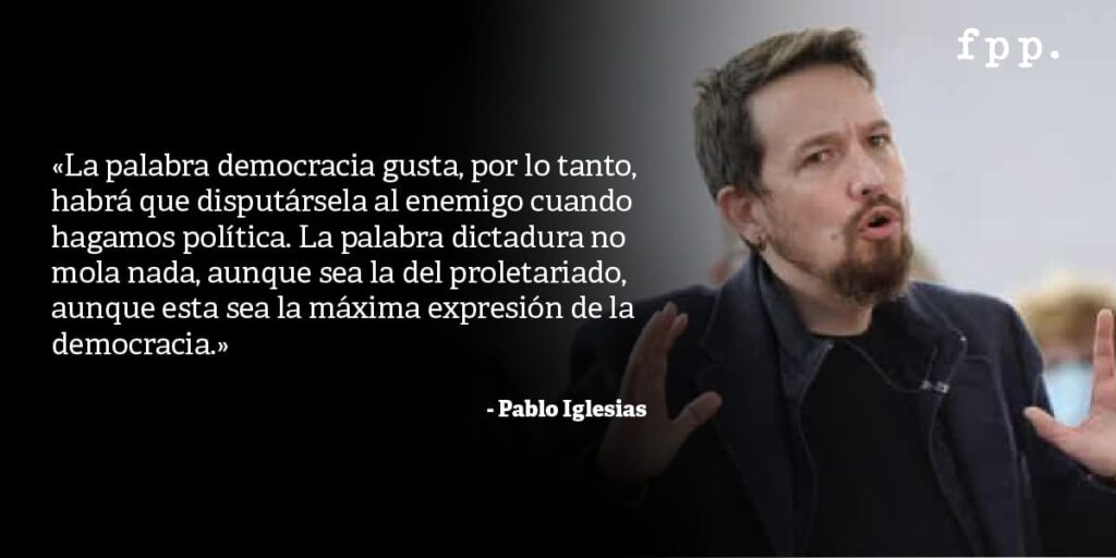 Este hecho que se confirma en discursos de personajes como Pablo Iglesias, exsecretario general de Podemos en España, que abiertamente ha confesado el uso exclusivamente propagandístico de la democracia. «La palabra democracia gusta, por lo tanto, habrá que disputársela al enemigo cuando hagamos política. La palabra dictadura no gusta nada, aunque sea la del proletariado, aunque esta sea la máxima expresión de la democracia», destaca.