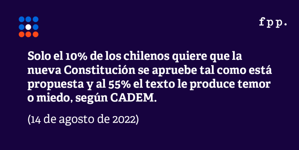 Esta premisa se refleja en los números de las últimas encuestas que exponen un profundo descontento con el resultado de la Convención: según Cadem, solo el 10% de los chilenos quiere que la nueva Constitución se apruebe tal como está propuesta y al 55% el texto le produce temor o miedo. La misma empresa indica que, para el 14 de agosto, el 46% de los chilenos rechazaría la propuesta, ocho puntos más que las personas que optarían por aprobarla, quienes además lo harían en gran medida con intención de reformar varios de sus artículos.