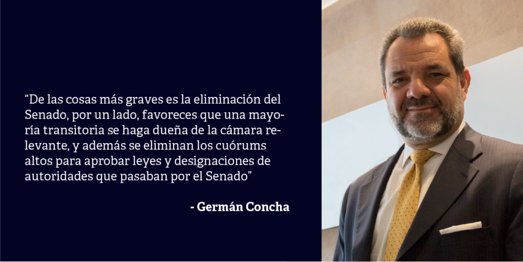 Germán Concha, profesor de Derecho Constitucional de la Universidad Católica de Chile, también indica, en su participación en el curso Proyecto de nueva Constitución en fácil de la FPP, que el efecto de “desarmar” los modelos de congreso bicameral no tiene en general buena experiencia, enfatizando en que los congresos de una sola cámara suelen estar más asociados a proyectos de corte dictatorial. “De las cosas más graves es la eliminación del Senado. Por un lado, favoreces que una mayoría transitoria se haga dueña de la cámara relevante y, además, se eliminan los cuórums altos para aprobar leyes y designaciones de autoridades que pasaban por el Senado, como los consejeros del Banco Central, los ministros de la Corte Suprema o el Contralor General de la República”, manifiesta.