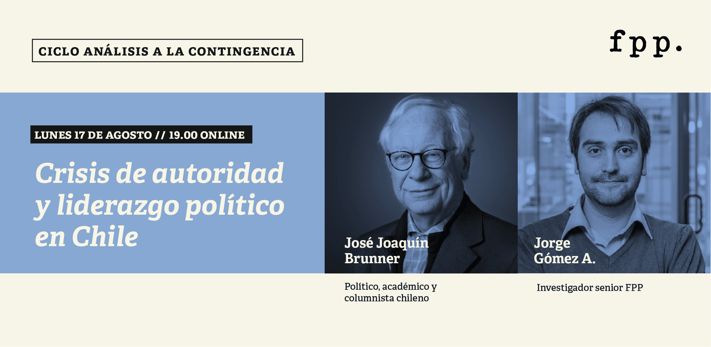 Discutiremos sobre qué ocurre con la política en Chile, las causas de la crisis transversal del liderazgo y sus consecuencias, junto a Jorge Gómez, Investigador Senior FPP, y José Joaquín Brunner, destacado académico y líder de opinión.