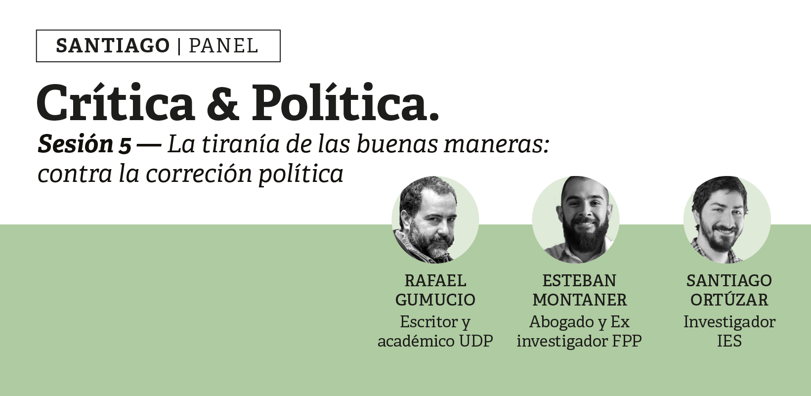 FPP te invita a reflexionar sobre la tiranía de las buenas maneras y la amenaza que esta supone para la libertad de expresión junto a Rafael Gumucio, académico de la Universidad Diego Portales y reconocido escritor chileno, Santiago Ortúzar, sociólogo de la Pontificia Universidad Católica de Chile e investigador del Instituto de Estudios de la Sociedad y Esteban Montaner, Abogado de la Pontificia Universidad Católica de Valparaíso y ex investigador FPP.