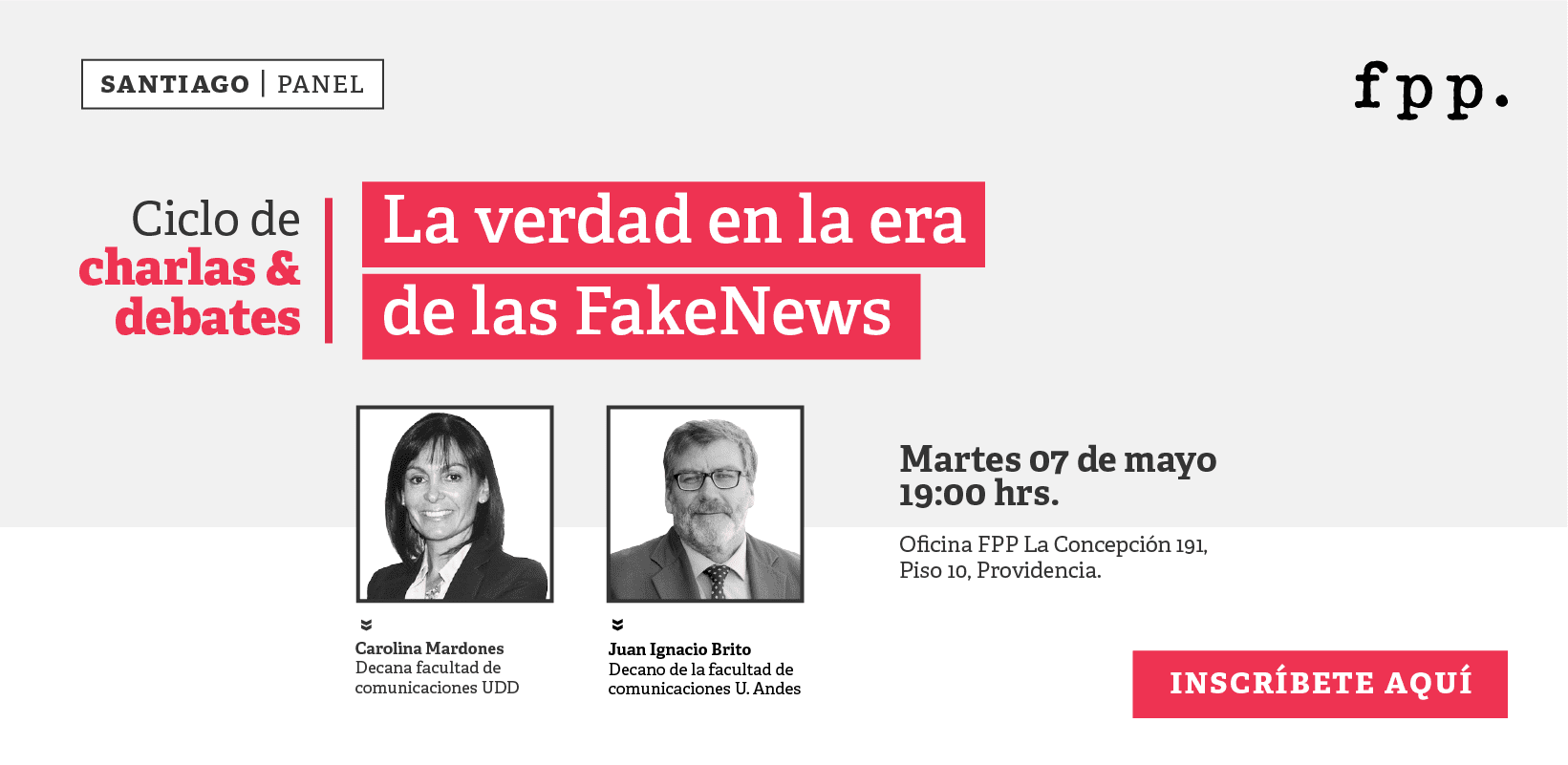 FPP Santiago te invita al panel "La verdad en la era de las Fake News" junto a Carolina Mardones, Decana de la Facultad de Comunicaciones de la Universidad del Desarrollo, y Juan Ignacio Brito, Decano de la Facultad de Comunicaciones de la Universidad de los Andes.