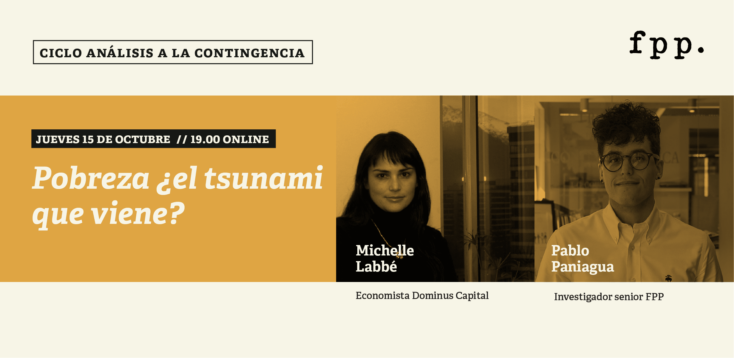 FPP te invita a la charla online "Pobreza ¿el tsunami que viene?" donde hablaremos sobre los efectos que la Pandemia tuvo y tendrá sobre nuestra economía, junto a Michelle Labbé y Pablo Paniagua. ¡Inscríbete aquí! Jueves 15 de octubre.
