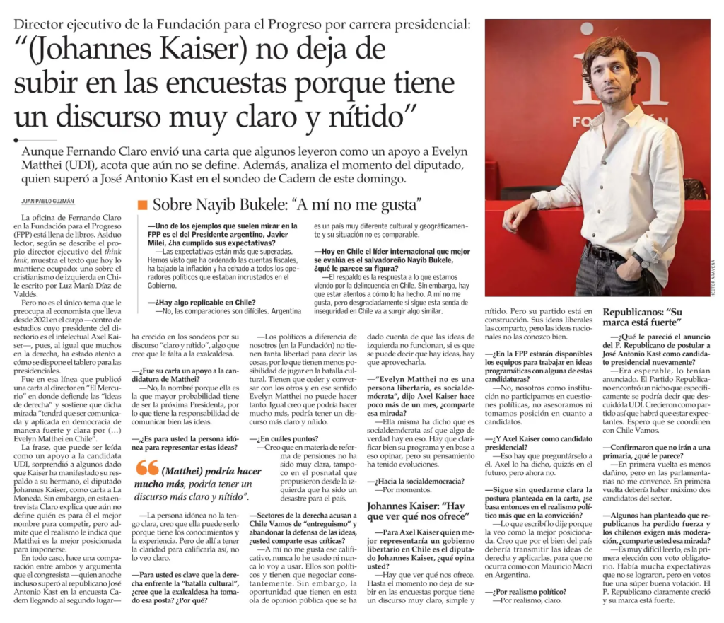 La frase, que puede ser leída como un apoyo a la candidata UDI, sorprendió a algunos dado que Kaiser ha manifestado su respaldo a su hermano, el diputado Johannes Kaiser, como carta a La Moneda. Sin embargo, en esta entrevista Claro explica que aún no define quién es para él el mejor nombre para competir, pero admite que el realismo le indica que Matthei es la mejor posicionada para imponerse.