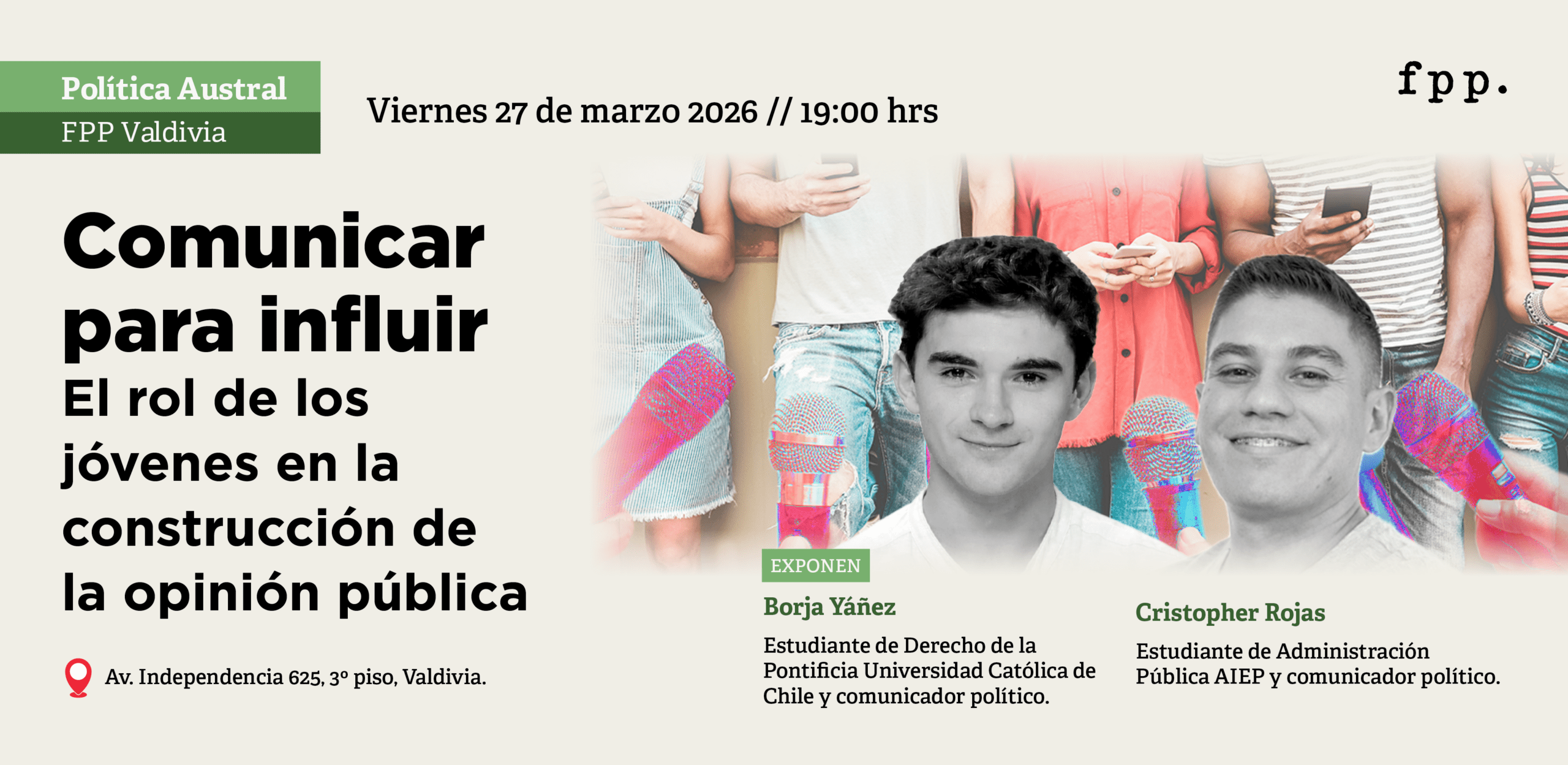 Fundación para el Progreso Valdivia te invita a un nuevo ciclo de Política Austral, una instancia de conversación abierta sobre los principales desafíos del debate público actual, con especial foco en la comunicación política y el rol de los jóvenes en la discusión pública.