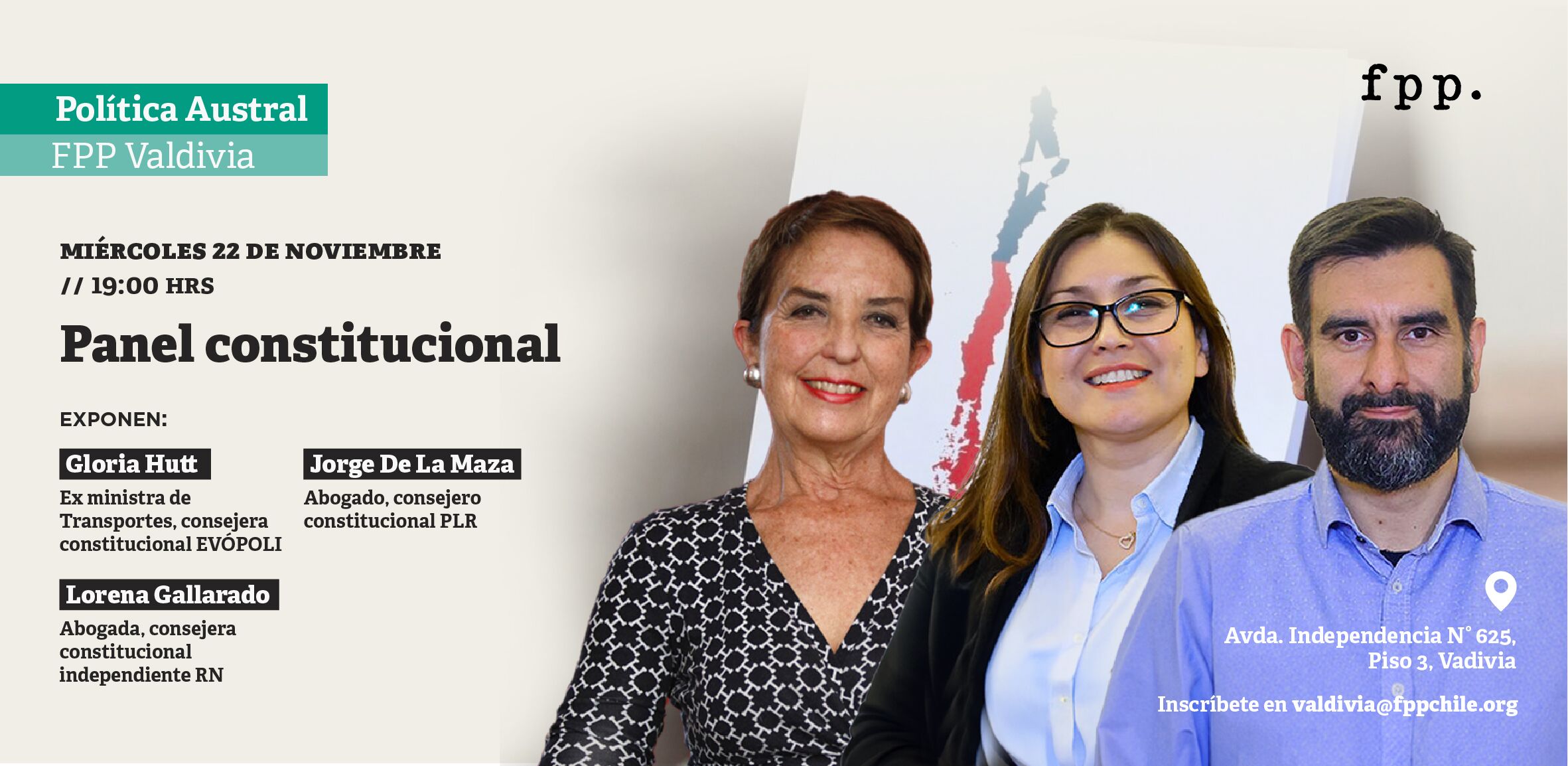 En esta ocasión, nos acompañarán: Jorge De La Maza (Partido Republicano), Lorena Gallardo (RN) y Gloria Hutt (Evópoli) . La actividad será moderada por Luis Palacios, profesor de derecho constitucional Universidad San Sebastián sede Valdivia.