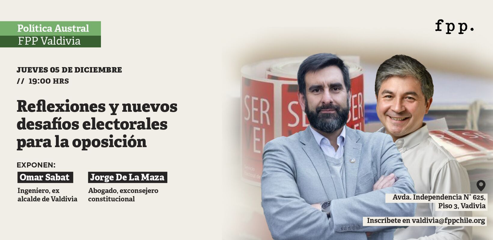 FPP Valdivia te invita a un evento donde estaremos conversando sobre cómo la fragmentación de los partidos del sector de la derecha ha influido en los resultados electorales recientes. Además, analizaremos los desafíos que se vienen de cara a las próximas elecciones parlamentarias.