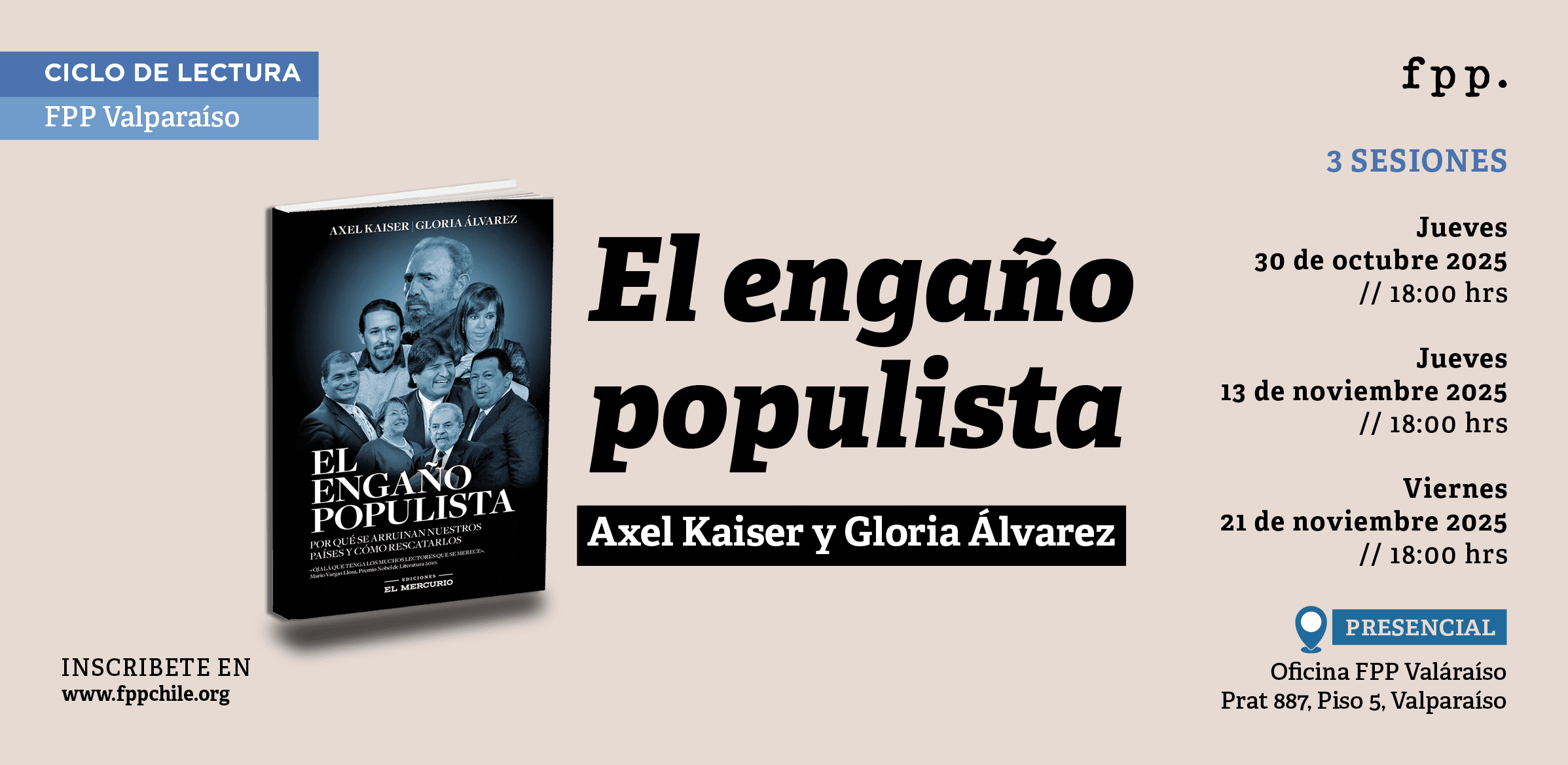 Fundación para el Progreso Valparaíso te invita a participar en un nuevo ciclo de lectura en torno al libro «El Engaño Populista», de Axel Kaiser y Gloria Álvarez; una instancia para reflexionar y debatir sobre cómo los discursos populistas han contribuido al deterioro institucional, político y económico en distintos países de Latinoamérica.