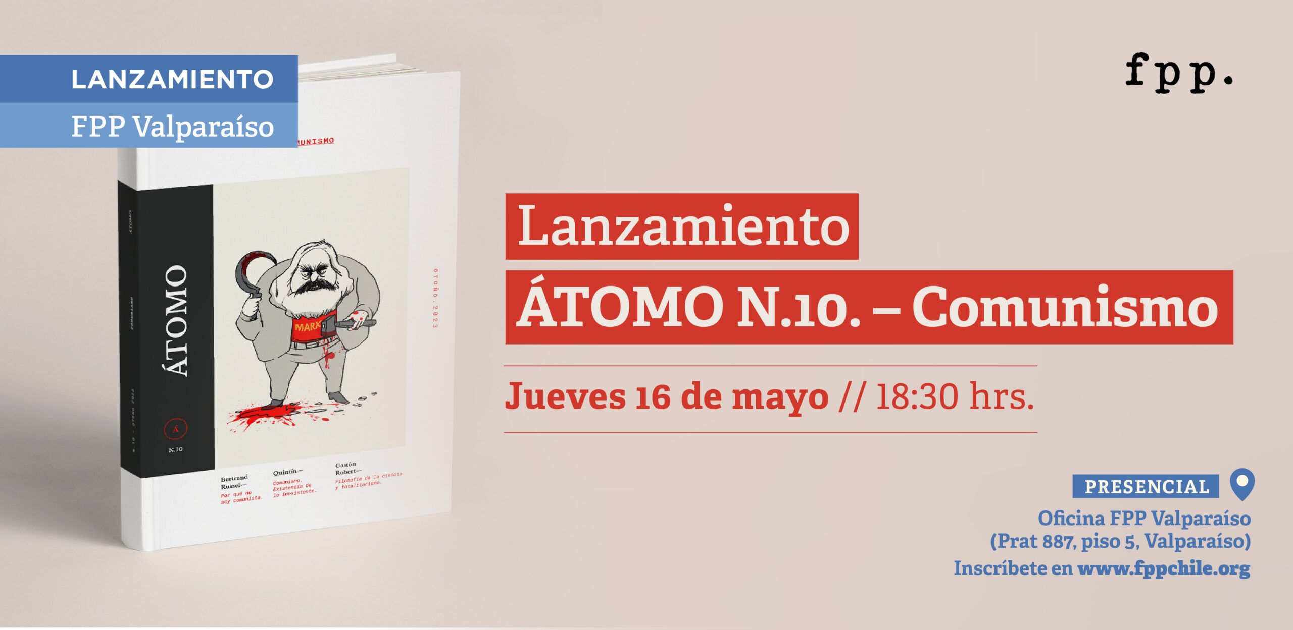 Fundación para el Progreso Valparaíso te invita al lanzamiento de la revista ÁTOMO N.10., editada por FPP, titulada Comunismo, la cual se concentra en el comunismo y su relevancia histórica y presente. También se analiza esta corriente desde diferentes perspectivas e incluye textos de Héctor Soto, Vicente Huidobro, Bertrand Rusell, J.M. Keynes, entre otros, además de, como siempre, reseñas de música clásica, jazz, entrevistas y revisiones de otros libros actuales.