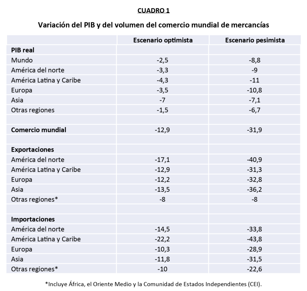 Las medidas adoptadas para contener la pandemia –que por regla general han implicado un aislamiento masivo entre y dentro de los países, así como una disrupción mayor de las actividades productivas, comerciales y de transporte– han desencadenado una recesión a escala mundial y una fuerte caída del comercio internacional. La Organización Mundial del Comercio (OMC) estimó el 8 de abril que el volumen del comercio de mercancías podría caer un 13% en 2020, pero su Director General, Roberto Azevêdo, advirtió que la cifra podría llegar hasta 32% si la pandemia no es controlada y los gobiernos fracasan en la coordinación de sus respuestas políticas. Esto en el marco de un escenario de fuerte recesión de la economía mundial, que podría ir desde una caída de -2,5% del PIB global hasta -8,8%, con América Latina y el Caribe sufriendo el impacto más duro con un descenso estimado del PIB entre -4,3% y -11%. El cuadro 1 resume las proyecciones de la OMC.