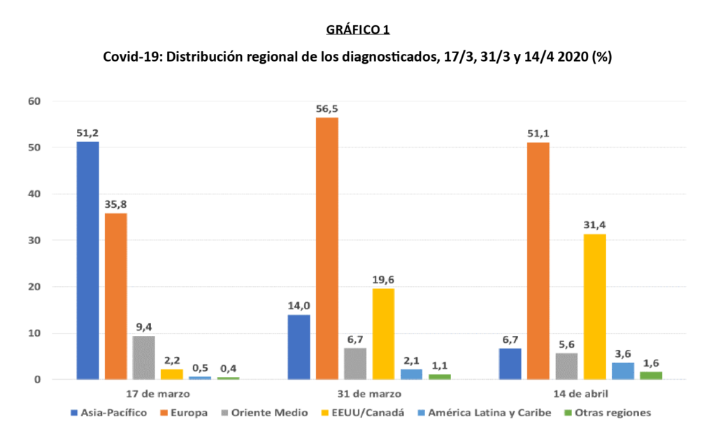 El gráfico 1 muestra la evolución de la distribución regional de los diagnosticados con coronavirus durante las cuatro semanas que van del 17 de marzo al 14 de abril, mientras que el gráfico 2 muestra la evolución de la distribución regional de los fallecidos, en ambos casos de acuerdo con los datos de la Organización Mundial de la Salud (OMS).