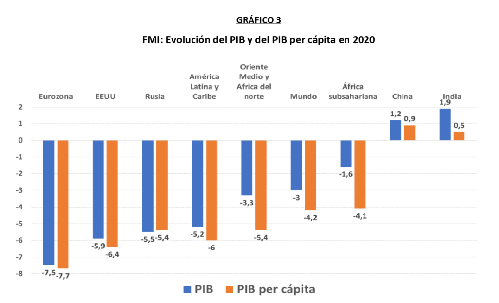 Por su parte, el Fondo Monetario Internacional (FMI), como expuso su Directora Gerente Kristalina Georgieva el 9 de abril, esperaba un crecimiento del ingreso per cápita para 2020 en más de 160 de sus 189 países miembros antes del brote pandémico. Hoy, por el contrario, se estima que 170 países experimentarán una caída del ingreso per cápita en lo que el Fondo caracteriza como la peor crisis económica desde 1929. La profundidad de la recesión y su impacto en diversas regiones y países se resume en el gráfico 3, basado en el informe del FMI presentado esta semana.