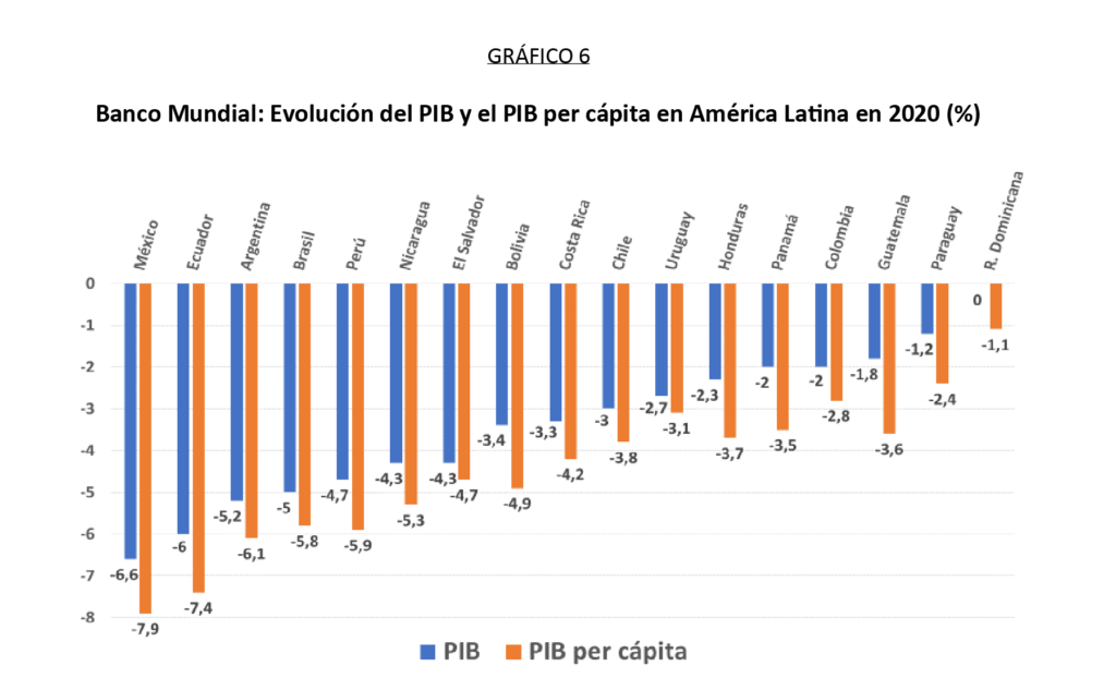En años recientes se ha llegado incluso a experimentar un reiterado decrecimiento del ingreso per cápita a nivel regional, lo que ahora se verá drásticamente agravado ante una caída del PIB de inusitadas proporciones. El domingo recién pasado el Banco Mundial entregó su pronóstico para la región, con una caída del PIB para el conjunto de América Latina y el Caribe en 2020 de -4.6%. El pronóstico país por país se presenta en el siguiente gráfico, donde también se calcula la variación del PIB per cápita, que es lo más relevante para evaluar el impacto real de la crisis económica en ciernes.