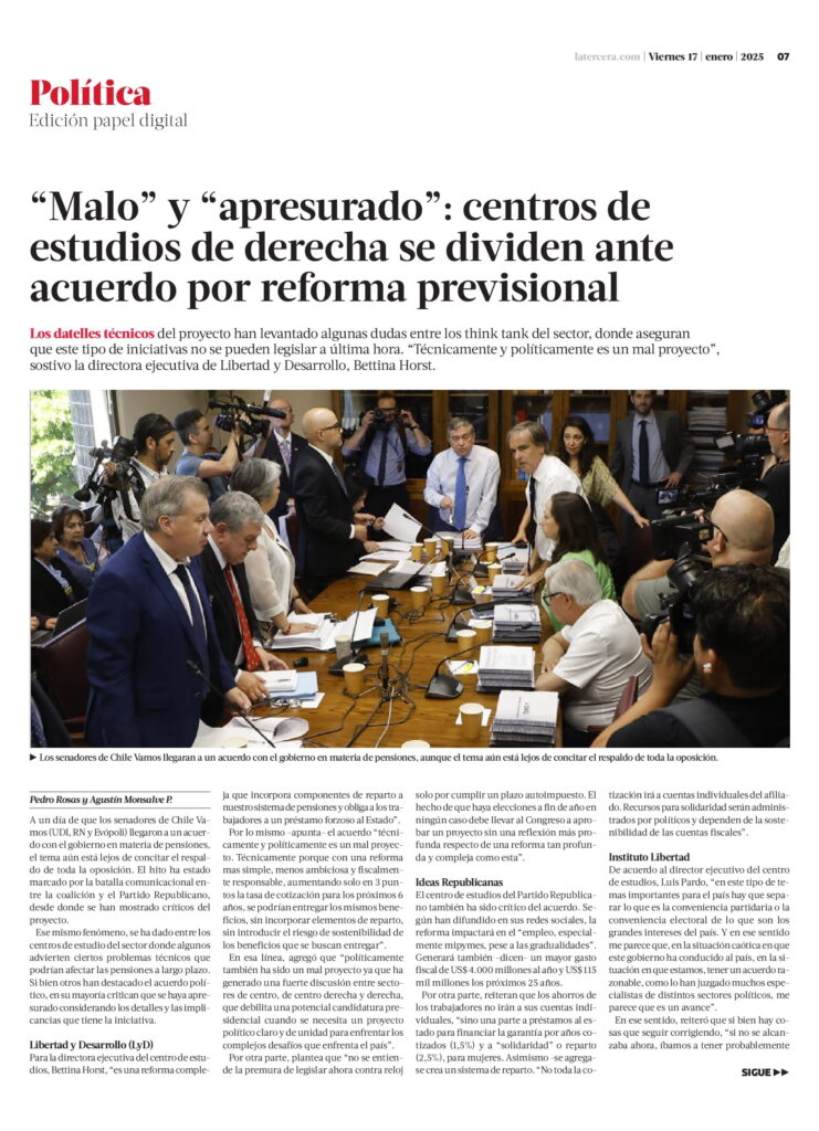El investigador del instituto, Álvaro Vergara, afirmó que «todavía estamos reflexionando sobre la reforma, sobre todo en los detalles técnicos. En aspectos generales, en la dimensión política vemos todo más o menos de una manera positiva, que se haya podido llegar a acuerdos entre la cierta parte de la oposición y el oficialismo. Pero tenemos diferencias respecto a ciertas bajadas técnicas del acuerdo. Cuánto, por ejemplo, podría impactar la reforma en la informalidad; qué tan presionados se van a ver los empleadores, sobre todo en el mundo de las pymes, con la carga positiva que va a generar la reforma; cómo va a funcionar el nuevo sistema».