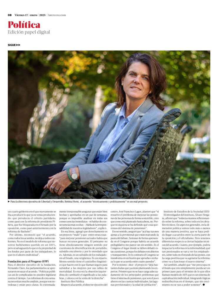 Para la directora ejecutiva del centro de estudios, Bettina Horst, «es una reforma compleja que incorpora componentes de reparto a nuestro sistema de pensiones y obliga a los trabajadores a un préstamo forzoso al Estado».